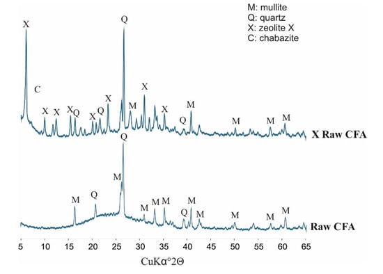 In recent years, many solutions for the management of fly ash have been put forward. Despite the interesting proposals for the management of ashes, the hazardous properties of fly ashes should be taken into account. The heavy metal concentration in coal fly ash varies depending on the type of coal. High levels of arsenic (2.8–6300 ppm), mercury (0.02–0.36 ppm), molybdenum (1.2–236 ppm) and selenium have been reported []. Several scientists have proposed the use of fly ash in agriculture, mostly as soil fertilizing additives [,,,,], as additive in concretes [,,,,], building materials such as bricks [,,,] and asphalts [,,,]. Utilisation via the synthesis of zeolite materials is one of the researched and considered possibilities of using fly ash [,,,,]. The hydrothermal reaction using strong alkaline medium leads to the dissolution of many compounds from fly ash. Considering the use of zeolites as heavy metal adsorbents, knowledge about the loading of the hazardous elements and their mobility during application for wastewater treatment and soil remediation is necessary [,]. Studies on the mobility of metals (investigated via leaching in aqueous solutions at various pH, for example, 1, 2, 12, 13) such as arsenic, lead, chromium and cadmium in zeolites have shown that, due to the zeolitization process, heavy metal elements are immobilized in the zeolite structure, while part of the metalloid elements migrated into the wastewater. The opposite was observed in the case of fly ash, where migration of toxic elements was noticed, which confirms the need to recycle coal fly ash [].