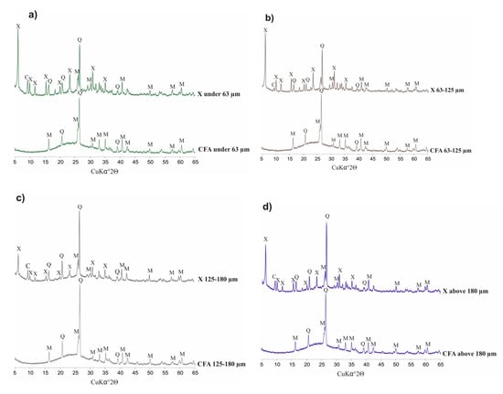Phase analysis of CFA (coal fly ash) samples, after sieving, and zeolites obtained from them.(a) CFA fraction under 63 µm and X type zeolite from it; (b) CFA fraction from 63 µm to 125 µm and X type zeolite from it; (c) CFA fraction from 125 µm to 180 µm and X type zeolite from it; (d) CFA fraction above 180 µm and X type zeolite from it.