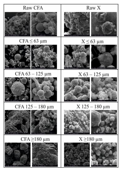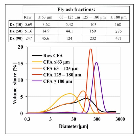 Figure 5 below presents an analysis of the particle size distribution of fly ash sieved through appropriate sieves, which confirms the progressive nature of the sieving process. The most even particle size distribution characterises the raw CFA sample. Sieved fly ash samples form two groups and have evidently different characteristics. CFA samples <63 µm and equal to 63–125 µm are slightly similar in shape to raw CFA. On the other hand, the functions of CFA samples of 125–180 and >180 µm are much sharper and more concentrated around a narrower group of particle size values. The observation of a relation with the Dx (10), Dx (50) and Dx (90) indices is more proof of the effectiveness of the sieving process but this also indirectly provides us with further knowledge about the heterogeneity of fly ash particle shapes. This is especially visible for CFA samples of 125–180 µm where the Dx (90) indicator is 232 µm. This indicates that, despite the use of a sieve with a 180 µm mesh screen, some bigger particles got through the sieve. This confirms the heterogeneous nature of the fly ash particles’ shape, which is probably needle- or spindle-like, elongated in one direction.