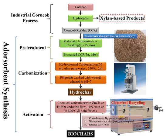 As illustrated in Figure 2, LCR was hydrothermally carbonized (250 °C, 2 h) first to hydrochar. Subsequently, the hydrochar was chemically activated using either H3PO4 or ZnCl2 as the activating agent. Finally, the biochar products were used for metal ion removal from aqueous solutions through an adsorption mechanism.