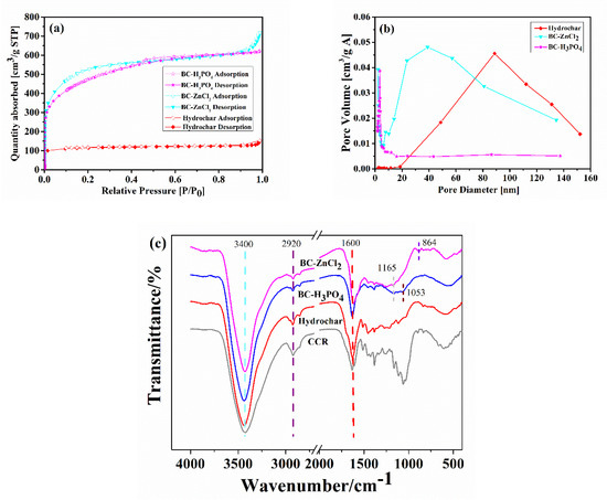 Physicochemical properties of the Biochars. (a) Nitrogen adsorption and desorption isotherms of Hydrochar, BC-H3PO4 and BC-ZnCl2 at 98 K; (b) Pore size distribution of Hydrochar, BC-H3PO4 and BC-ZnCl2; (c) FT-IR spectra of CCR, Hydrochar, BC-H3PO4 and BC-ZnCl2.