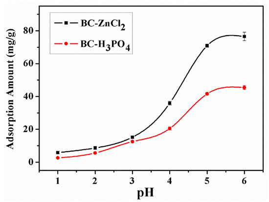 The point of zero charge (pHpzc) (Table 1) was determined by analyzing the zeta potential charge when varying the pH range from 2 to 8. As shown, for the LCR sample, the pHpzc is 9.8, while the pHpzc of BC-H3PO4 and BC-ZnCl2 are 3.5 and 4.6, respectively. These results confirm the presence of these acid groups on the surface of activated carbons. Figure 5 exhibits the adsorption of Pb2+ under various pH. The adsorption amount of Pb2+ increased when the pH increased. The maximum adsorption amount (75.3 mg/g) was achieved at the pH of 5–6. When the pH is over 6, the metal precipitation would dominate, thus the adsorption of metal ions should be controlled [34]. The adsorption amount was minimal at low pHs (1–3), while the adsorption increased at elevated pHs (4–5). The metal ions will replace protons from the biochar at elevated pHs. When the pH is higher than the pHpzc, the surface of the sorbent is negatively charged, and attractive forces increase between the sorbent surface and metal ions. Furthermore, a higher pH favors the deprotonation of the sorbents’ phenolic and carboxylic acid groups, and thus, negative sites are created on both BC-ZnCl2 and BC-H3PO4 surfaces, thereby improving the adsorption of metal ions onto the surface of the sorbents. Mohan et al. [34] reported that the final pH of the solution is higher than the initial pH under acidic conditions, as neutralization and sorption are parallel processes; therefore, a pH of 5 was chosen as the optimal pH for performing the adsorption process.