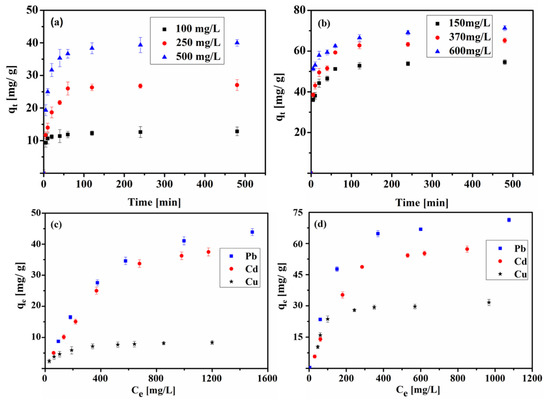 The adsorption isotherms of heavy metal ions are shown in Figure 4c,d (at 25 °C). For the BC-ZnCl2 sample, the adsorption uptake of Pb (II), Cd (II) and Cu (II) are 23.1–72.1 mg/g, 6.8–55.6 mg/g and 8.2–30.5 mg/g, respectively, which is highly dependent upon the initial concentration of these metal ions.
