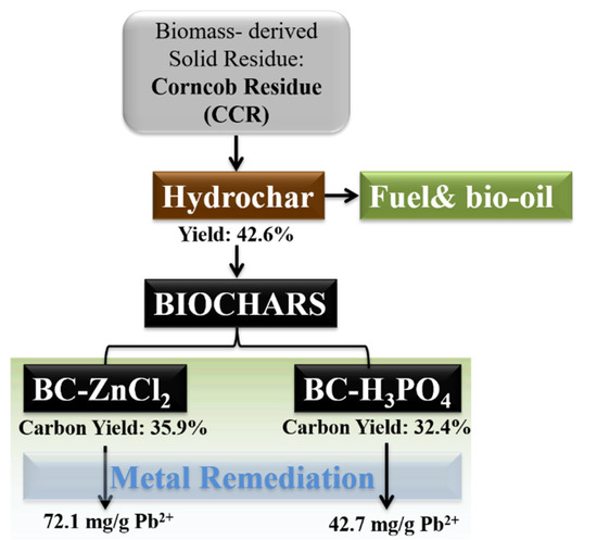 The concept of the biomass-derived biochar preparation for heavy metal ions removal is shown in Figure 7. In our previous study, corn cob residue was first utilized for the preparation of hydrochar through hydrothermal carbonization, which can be utilized for fuel, and then bio-oil can be obtained in this process. In order to convert the solid residue problem in this process, biochar was fabricated through a further chemical activation process. The carbon yield for BC-ZnCl2 and BC-H3PO4 is 35.9% and 32.4%, respectively. In addition, the chemicals could be recycled for activation in the next cycle (Figure 1). The as-prepared biochars were used for heavy metal ions removal. The adsorption amount for BC-ZnCl2 and BC-H3PO4 is 72.1 mg/g and 42.7 mg/g, respectively.