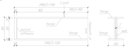 The plate girders had an overall length of 2480 mm, with an effective span of 2400 mm. The top and bottom flange were made of flat plates with a thickness of 20 mm and width of 260 mm. The beam had full-height transverse stiffeners located 40 mm away from its ends, made of flat 10 mm plates, with respective widths of 90 mm and 140 mm.