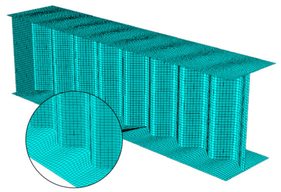 The distribution of stresses in the sinusoidal web and impact of the reinforced concrete slab on the stability of the sinusoidal web and failure mode can only be investigated using 3D finite elements [27,28,29,30,31,32]. This can be done using both shell and solid elements. Shell models are highly consistent with experimental measurements, and they do not require modelling of the welds between plate girder components [33,34,35]. All models were constructed in the preprocessor of Abaqus 2017 software [26], which uses the finite element method (FEM).