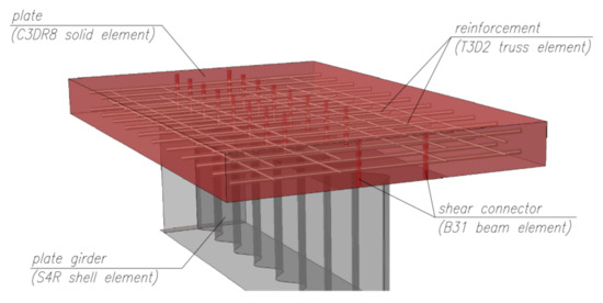 Figure 4 shows the FEM models of the considered beams. A model of half of the beam was created in each of the considered cases. Depending on the analyzed configuration, the models were created using four-node reduced-integration shell elements (S4R—plate girders with stiffeners), eight-node reduced-integration solid elements (C3D8R—concrete slab), two-node linear truss elements (T3D2—primary reinforcement bars and stirrups), and two-node linear beam elements (B31—connecting fasteners). Both the rebars and the rigid fasteners were modelled discretely as elements embedded in the slab attached to the beam, which was the host element (Figure 5).