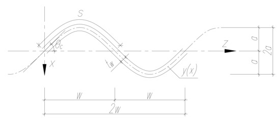 The corrugation was modelled in accordance with Figure 6, based on Equations (1) and (2) describing the sinusoid curve, with reference to the corrugation amplitude (a = 25 mm) and projected length of half of the corrugation (w = 75 mm):