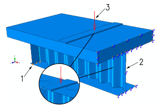 The loading points for external loads were selected as for the standard four-point beam bending configuration, in such a way that the bending moment was constant along the 800 mm section in the middle of the beam (see Figure 1). In the numerical calculations, the concentrated load (labelled “3” in Figure 9) was applied perpendicularly to the loaded surface through an intermediate perfectly rigid body.