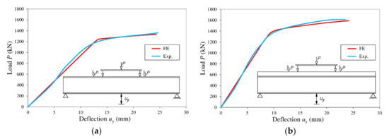 The consistency of the experimental and numerical results is also noticeable in the ultimate external loads (Pult) and ultimate failure modes of the beams (Figure 11). The ratio of the ultimate load determined through numerical analysis (Pult,FE) to the experimental ultimate load (Pult,Exp) was 0.98 for the steel beam and 0.99 for the steel beam bonded to a reinforced concrete slab. In both cases, failure occurred in the area of interaction of the bending moment and shear force, due to buckling causing the appearance of a yield line in the web.
