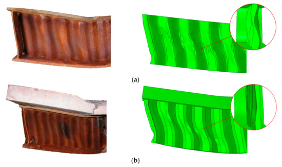 Comparison of failure modes caused by global buckling of the web determined through experimental tests and numerical analysis: (a) steel beam; (b) beam bonded to a reinforced concrete slab.