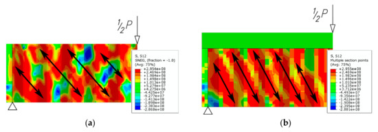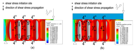 In the steel beam bonded to the reinforced concrete slab, the initial shear stresses appear in and propagate from the first corrugation located closest to the support stiffener (Figure 12b). In the non-composite steel beam, the place of initiation of shear stresses is located differently than in the composite beam because the stresses originate in more distant corrugations, located slightly further away from the support stiffener (Figure 12a).