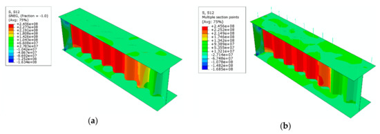 Final post-buckling shear stress distribution in the sinusoidal web (unit: Pa): (a) steel beam; (b) beam bonded to a reinforced concrete slab.