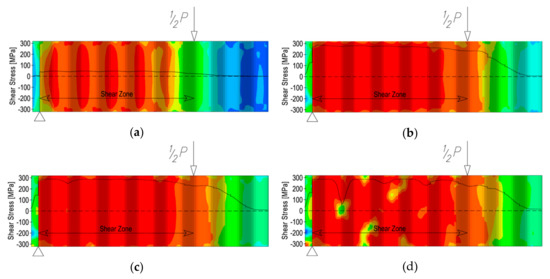 During the first stage of loading before buckling, shear stresses are distributed uniformly along the web (Figure 16a). With increasing load, shear stresses rise linearly (Figure 16b) until the formation of the first plastic hinge (Figure 16c). At this point, the shear stresses reach the maximum level. A continued load increase results in the formation of further places where buckling appears. At the buckling points, the shear stresses quickly decrease (Figure 16d). After buckling, the shear stresses locally disappear. This process occurs from the direction of the supports towards the axis of the beam.