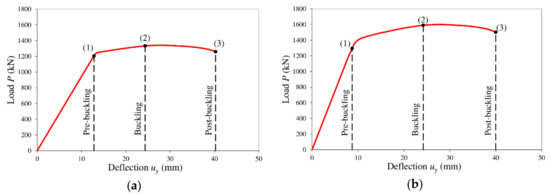 An increase of the load above the critical shear strength results in global web buckling. After the maximum load is reached and point (2) is exceeded, vertical displacements uy increase, with a simultaneous decrease of load levels. At this stage, yield lines are also formed in the web. At point (3), in both cases, the yield lines propagate, leading to the failure of the girder.
