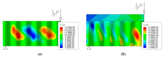 Final distribution of displacements uz in the transverse plane of the web (unit: m): (a) steel beam; (b) beam bonded to the reinforced concrete slab.