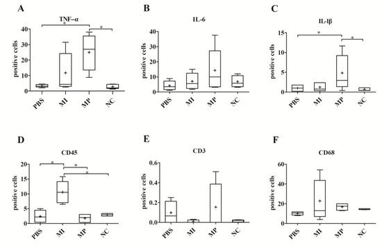 The MP group showed a significantly higher number of CD45-positive cells compared with the PBS group (p < 0.05). Likewise, the MI group had a significantly different number of CD45-positive cells compared with the PBS group (p < 0.05). Interestingly, in terms of CD45, there was no significant difference between the MP group and the MI group (Figure 2A).