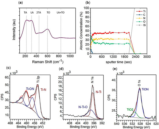 Structural characterization of 400 ALD cycles TiN on MgO using (a) Raman spectroscopy and XPS (b) depth profile, (c) titanium 2p region, (d) nitrogen 1s region, and (e) oxygen 1s region.