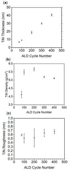TiN thin film properties from XRR: (a) thickness, (b) density, and (c) roughness as a function of the number of ALD cycles.
