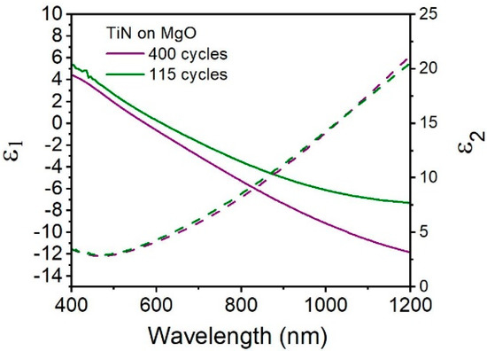 We then characterized the optical properties of these TiN thin films and evaluate their potential to be used in plasmonic devices. The optical properties of the as-prepared TiN were measured using spectroscopic ellipsometry (SE). As seen in Figure 3, TiN films on magnesium oxide (MgO) substrates with thickness of 42 and 11 nm were measured. MgO was selected as the initial test substrate due to its near-perfect lattice match with TiN: both are cubic crystal systems with lattice constants of 4.23 Å for TiN and 4.21 Å for MgO. SE using a Drude-Lorentz function with one Lorentz operator [12] reveals the real and imaginary parts of the dielectric function (ε1 and ε2) over the range 400–1200 nm. First, we observed that the ε2 values for the TiN films are similar for both thicknesses, displaying values over wavelength consistent with previous findings [2,18], indicating that the TiN films has similar optical losses. For TiN thin and ultrathin films, ε2 reaches a minimum value of approximately 2.9 at the wavelength 465 nm. More importantly, it is observed that the slope of ε1 is negative for both TiN samples, indicating the TiN is optically metallic. As expected based on previous studies [18], thicker TiN films are more metallic, especially in the higher wavelength region of 800–1200 nm. The plasmon wavelength, defined as ε1(λ) = 0, is located at 574 nm for TiN prepared by 400 cycles. The ultrathin film shows a comparatively red-shifted plasmon resonance of 613 nm, which has been seen previously in ultrathin TiN [12,18]. This demonstrates that TiN of various thicknesses produced by this PE-ALD method has tunable, visible light plasmon resonances for thin films.