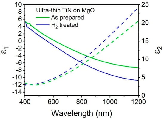 Real (solid lines) and imaginary (dashed lines) values of permittivity of ultrathin TiN (100 cycles) on MgO as prepared (green) and after hydrogen plasma anneal (blue).