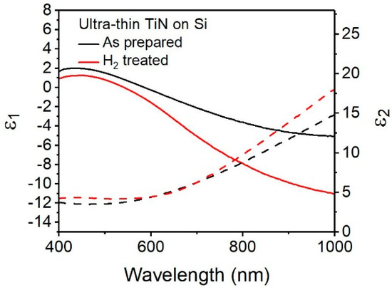 TiN’s compatibility with silicon is another advantage of alternative plasmonic materials over gold or silver. However, unlike those traditional plasmonic metals, TiN has been demonstrated to have substrate-dependent optical properties and, therefore, it cannot be assumed that the optical properties of TiN on one substrate will be identical to another [8,9,34]. Figure 5 shows the as-prepared TiN (black) has plasmonic character on Si <100> for near 10 nm TiN. The slope of ε1 in the visible region is similar to ultrathin TiN on MgO in the region of 500–900 nm, though the TiN shows dielectric behavior (a flattening of ɛ1) at wavelengths over 900 nm. This is, in part, attributed to the oxygen composition in the TiN, and is consistent with previous findings of TiN thin films on silicon with oxygen contents between 10% and 25% [10,35]. With the post-deposition plasma treatment this flattening of ɛ1 is reduced, consistent with Yun et al. findings that such treatments reduce surface oxidation [30] The slope and position of ɛ1 indicate a broad plasmon resonance centered at 586 nm, with a corresponding ɛ2 value of 4.21. That the plasmon wavelength is red-shifted for TiN on Si compared to the plasmon wavelength of TiN on MgO is likely due to lattice mismatch between silicon and TiN [9]. The trends observed for and , post-hydrogen treatment, are similar to the ones observed before, and can be explained in a similar manner as above. Therefore, we demonstrate that plasmonic TiN can be deposited on Si via PE-ALD and that post-deposition treatment with hydrogen plasma is a viable method to tune the optical properties of prepared TiN on silicon and result in a metallic film.
