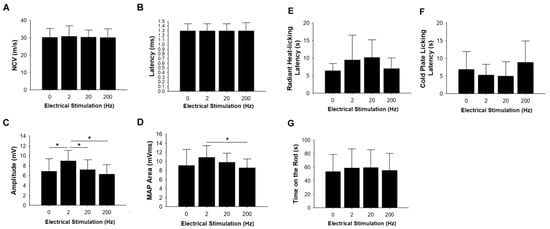 Analysis of evoked muscle action potentials (MAPs), including (A) nerve conduction velocity (NCV), (B) latency, (C) peak amplitude, and (D) area under the MAP curves. Analysis of electrical stimulation on thermal and motor coordination tests, including (E) radiant heat, (F) cold plate licking latency, and (G) time-on-the rod tests. * Significant differences between conditions, P < 0.05.