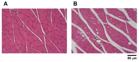 (A) Normal rat gastrocnemius muscle. (B) Evident muscle atrophy is noted in all of the taxol-treated rats with or without electrical stimulation. Scale bar = 80 μm.
