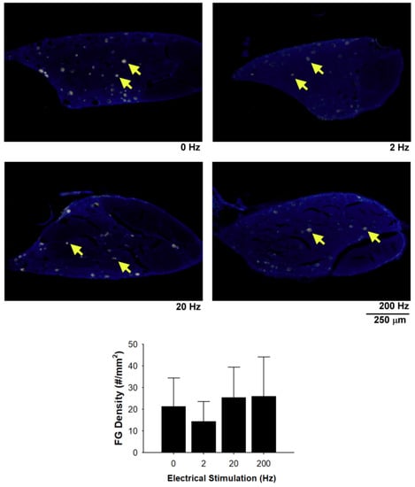 Representative images of the retrograde axonal tracing with fluorogold (arrows) in taxol-treated rats. No significant difference was seen in the number of fluorogold-labelled cell in dorsal root ganglions (DRGs) among the four groups with different frequencies of electrical stimulation. Scale bar = 250 μm.