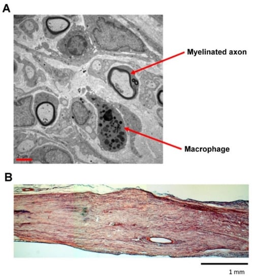 TEM showed that endoneurial macrophages were very close to Schwann cells wrapping the myelinated axon (Figure 6A). Figure 6B shows a representative longitudinal view of regenerated nerves with a bundle of newly-developed nerve fibers.