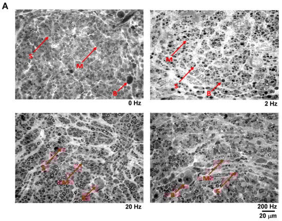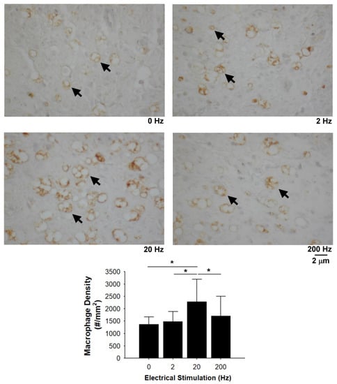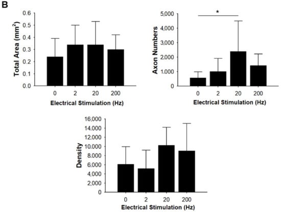Figure 8 depicts the expression of macrophage CD68 in regenerated nerves. Quantitative immunostaining data for CD68 reflected that mid-frequency (20 Hz) electrical stimulation could significantly increase macrophage infiltration into the injured sites compared with the sham control, 2 Hz, and 200 Hz groups.