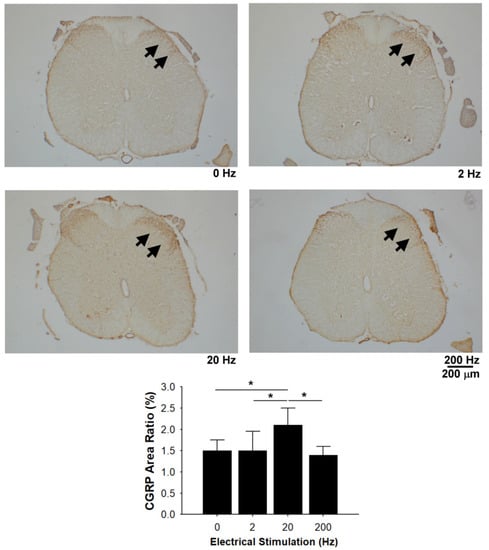 Immunohistochemical staining demonstrated the presence of CGRP-labelled fibers in the area of lamina of the dorsal horn in all of the rats. Quantitative data revealed that CGRP expression was significantly increased in the mid-frequency (20 Hz) stimulation group compared with the sham control, 2 Hz, and 200 Hz groups (Figure 9).