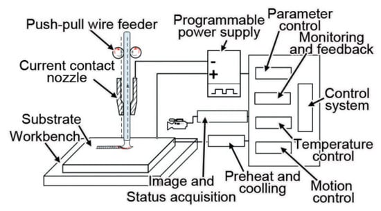 In-space metal materials’ additive manufacturing technology has been applied to the manufacture and repair of metal parts in the orbit. It will become an important research direction in the future aerospace manufacturing field [1,2,3]. At present, the heat sources used in metal additive manufacturing technology are mainly laser beams, electron beams, plasma beams, and arc beams [4,5]. Apart from the ground environment, the space environment poses severe challenges for metal additive manufacturing technology, including the current heat transfer system, the additive manufacturing process, and heat source equipment [6,7]. Metal wire additive manufacturing technology using a laser beam as a heat source has the advantages of high energy density, high precision, high efficiency, and high flexibility [8,9]. However, in this approach, the device structure is relatively complicated, the power output is high, and the energy utilization rate is relatively low. Compared with the laser heat source, the electron beam heat source has higher energy utilization. However, the device structure is also relatively complicated in this approach [10,11]. Wire additive manufacturing technology using the plasma beam as a heat source have the characteristics of high heat input, high utilization rate, high manufacturing efficiency, and rapid manufacturing [12,13]. However, the arc is difficult to ignite due to the influence of the low-pressure environment in space. Our research group proposed a metal manufacturing method suitable for space environments and resistive heating metal wire additive manufacturing technology [14]. The electrical energy is converted into Joule heating by the current, and the wire was melted and shaped. This method has the advantages of high thermal efficiency, precise heat input control, and simple additive manufacturing equipment [15,16,17].