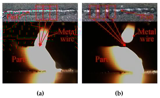 The morphology of resistance heating metal wire additive manufacturing. (a) Continuous melting and (b) disconnected melt.