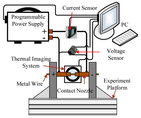 Figure 4 shows the experimental system for the resistance heating single and double metal wire melting process. The metal wire passes through two coaxial current contact nozzles. The programmable power source outputs current. The short-circuit current flows through the metal wire body to generate Joule heat, which accumulates heat and the metal wire melts. Optris PI Xi 400 (Optris GmbH, Berlin, Germany) was used to collect the temperature changes during the melting process of the wire. Voltage sensor CHV-25P (Beijing SENSOR Electronics Co., Ltd., Beijing, China) and current sensor CHB-500S (Beijing SENSOR Electronics Co., Ltd., Beijing, China) were used to collect the change of the electrical signal during the melting process of metal wire. The computer synchronously collects the electrical signal and temperature change of the metal wire melting process through the National Instruments acquisition card. The frame frequency of the thermal imager is 1000 fps, the temperature range is 600 °C ~ 1800 °C, the voltage measurement range of CHV-25P (Beijing SENSOR Electronics Co., Ltd., Beijing, China) module is ± 25V, and the measurement range of CHB-500S (Beijing SENSOR Electronics Co., Ltd., Beijing, China) current sensor is ± 500A.