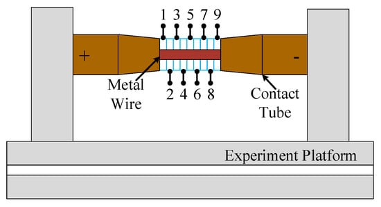 A constant current of 60 A, 80 A, and 100 A was chosen respectively to study the effect of the different current on the experiment. The specific experimental parameters are shown in Table 1 (1–1, 1–2, and 1–3). Moreover, the electrode distance of 4 mm, 6 mm, 8 and mm was chosen, respectively, to study the effect of the electrode distance on the experiment (Table 1 (2–1, 2–2, and 2–3)). In order to study the effect of the wire diameter on the experiment. The diameters of the metal wires are 0.8 mm, 1.2 mm, and 1.6 mm, respectively (Table 1 (3–1, 3–2, and 3–3)). The current flows through the double metal wires in coaxial contact, which is helpful to study the effect of the secondary contact interface after the disconnection of the metal melt in the experiment. The lengths of the metal double wire are 2 mm and 2 mm, 3 mm and 3 mm, and 4 mm and 4 mm, respectively. The specific experimental parameters (Table 1 (4–1, 4–2, and 4–3)).