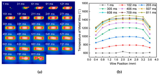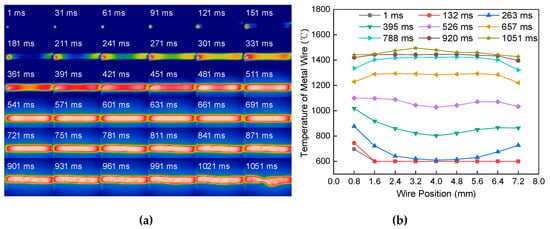 Figure 8a shows the melting process of the single wire at a constant current of 60 A passing through the length of 4 mm and a diameter of 0.8 mm. The heat transfer mode is similar to Figure 6a. However, the wire with a diameter of 0.8 mm has a faster heating speed. The temperature difference between the wire near both ends of the electrode and the middle part of the wire is large. Figure 8b shows the temperature distribution of the metal wire at different positions and different times. The temperature distribution is “bow-shaped”. With the increase of time, the temperature difference between the middle and both ends of the metal wire increased gradually.