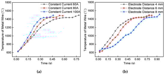 During the electro-thermal test, the short-circuit current passes through the wire and measures the change of wire temperature with time. Figure 10 shows the temperature change curve of the resistance heating wire melting process. With the increase of time, the temperature of the wire increases linearly, and, after the transient, the local temperature reaches a constant value. Figure 10a shows the effect of different current values on the temperature change of the wire. With the increase of a short-circuit current, the slope of temperature rise gradually increases. The time to achieve local heat balance gradually decreased, which is due to a large amount of Joule heat being released when the current with high current density passes through the wire. Figure 10b shows the effect of temperature change of the wire electrode distance. With the increase of wire length, the slope of temperature rise gradually decreases. The time to achieve local heat balance gradually decreases. This is because the increase of wire length leads to the increase of heating objects and the decrease in heating speed. After reaching the heat balance, the local heat holding time will decrease. Figure 10c shows the trend of temperature rise of metal wire with different diameters. As the diameter of the metal wire decreased, the temperature increase rate of the wire gradually increased, and the time to achieve local thermal equilibrium decreased. This is due to the decrease in the diameter of the wire leads to an increase in resistance, and the resistance value determines the heat generated by the metal wire. Figure 10d shows the temperature rising trend of the double metal wires of different lengths. The temperature of the metal wire first increased rapidly and then increased slowly. The speed of the temperature increase of the metal wires gradually decreased with an increasing length of the double metal wires, and the time to reach the local thermal equilibrium gradually increased. This is because the burrs and sharp changes at the interface of the double metal wires resulting in faster temperature rise for the wire. With the increase of the metal wire length, the increase of heat conduction distance leads to the increase of the heat balance time.