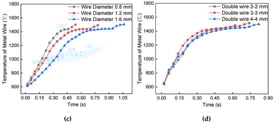 Resistance heating wire temperature trend. (a) Different short-circuit current, (b) electrode distance, (c) metal wire diameter, and (d) double metal wire length.