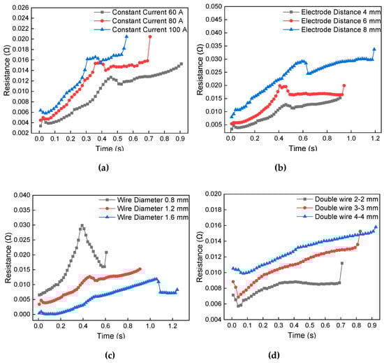Dynamic resistance change of metal wire during melting. (a) Different short-circuit current; (b) electrode distance, (c) metal wire diameter, and (d) double metal wire length.