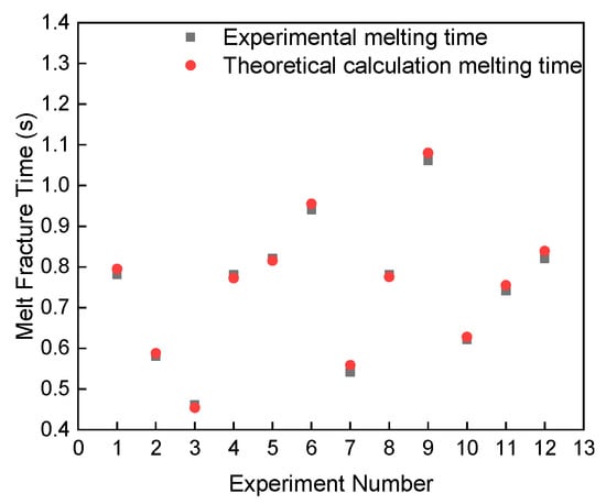 Figure 12 shows the relationship between the melting experiment and theoretical calculation. The variables with serial numbers of 1–3, 4–6, 7–9, and 10–12 in the figure are the melting time of different short-circuit current, different electrode distance, different wire diameter, and different double wire length. The error between the experimental and theoretical calculation time is about 2%, 2%, 4%, and 7%, respectively. The error between the melting time of the single wire and the theoretical calculation time is small, while the error of the double wire is large. The theoretical calculation ignores the burr and the sharp edge between the double wires. The time for continuous melting and secondary contact melting can be calculated by theory. Moreover, the additive manufacturing time of metal parts can be estimated by a theoretical calculation.
