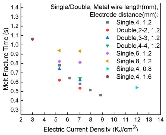 Figure 13 shows the dependence of the fusing time of the metal wire on the current density. The fracture time increased with the rise of the current density because the local temperature increases with the growth of current density, as shown in Equation (7). The fusing time decreased with the increase of current density. For small current densities, the melting time decreased with increasing wire length and with increasing wire diameter. The width of the oxide layer on the surface of the wire increased as the metal wire melts. The cross-sectional area of the current passing through the wire decreased and the local temperature increased, which accelerates the local melting. For small current density, when density current passes through the wire, the growth of the oxide layer on the surface is limited by the rapid decrease of Joule heat. For high current density, the coupling of surface oxidation and Joule heat determines the electric fusion of the wire.