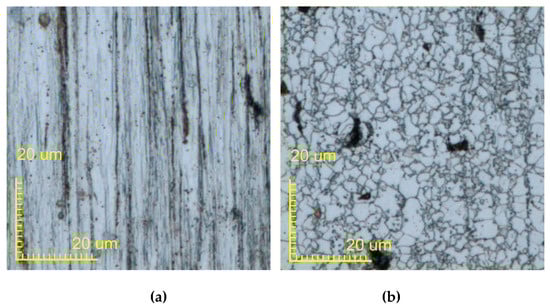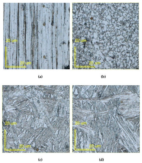 Figure 15 and Figure 16 show 200X micrographs of the single and double metal wire after melting and solidification, respectively. Figure 15a–d and Figure 16a–d show the microstructures of oxidation zone, heat affected zone, semi-melted zone, and melting zone of a single metal wire and the double metal wire, respectively. Figure 15a and Figure 16a show the microstructure in the oxidation region. Q235 wire is a product manufactured by the drawing process. This manufacturing process results in its microstructure becoming a unique band-shaped fine-grained ferrite and pearlite, which are fibrous deformation. Banded fine-grained ferrite and pearlite are relatively dense in some areas. In the oxidation area, due to the lack of sufficient heat energy to change, the structure of this area is roughly the same as the original structure of the wire. Figure 15b and Figure 16b show the microstructure of the heat-affected zone. The microstructure is a combination of ferrite grains being white and granular pearlite grains with block distribution. Black dots in the ferrite matrix are cementite particles. The gray grains at some grain boundaries are sulfide manganese inclusion. Black block is lamellar pearlite. Ferrite grain is small and evenly distributed. Because of low heating temperature and short holding time, the pearlite block has been transformed into austenite. Transformed into an acicular martensitic structure when it is cooled, ferrite has no transformation and is retained. After the temperature of the metal wire has approached the solid-liquid temperature, the wire begins to solidify. Figure 15c and Figure 16c show the microstructure in the semi-melted region with low-carbon martensite. Its microstructure is characterized by the same band-shaped martensite arranged in parallel, which forms martensitic bundles or martensite regions and results in a large positional difference between regions. Figure 15d and Figure 16d show the microstructure in the melted region. Due to the different degrees of decarburization of the wire, after heating, the ferrite structure is maintained in the decarburized layer. A small amount of low-carbon martensite appears in the ferrite, along with the troostite. The low carbon martensite has very little granular and un-melted ferrite. After the metal is melted and solidified, the microstructure consists of low carbon coarse martensite, and the sample was heated at a higher temperature to obtain coarse lath martensite.