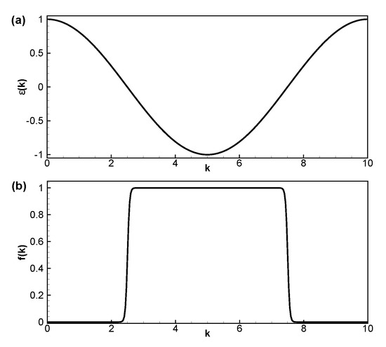 For the numerical simulations, we consider a simple tight-binding dispersion relation, ϵ ( k ) = cos ( 2 π k ) , k Ω k = [ 0 , L ] which is shown in Figure 1a. The numerical method has the full flexibility to handle a generic band structure; however, we opted to analyze this simple case, since it is familiar to the vast majority of the readers and yet it allows for the appearance of a number of nontrivial effects compared, for instance, to a parabolic band structure. The associated Fermi-Dirac distribution function is plotted in Figure 1b.