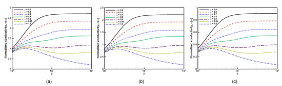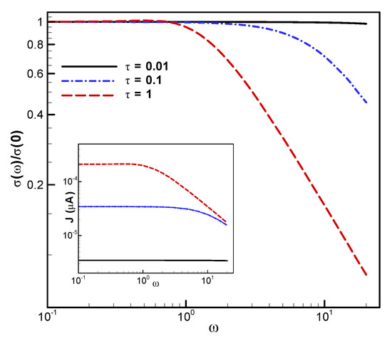 Finally, in Figure 3, we show the dependence of the conductivity on the relaxation time. Consistently with Equation (18), the relaxation time controls both the amplitude of the conductivity and the frequency at which the drop in conductivity is observed.