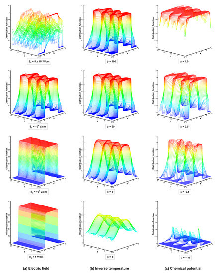 Further, we show the results for several positions of the chemical potential for a strong electric field. Figure 4c illustrates the effect of the chemical potential μ on the time evolution of the distribution function with E 0 = 10 4 V/cm, τ = 1.0 , β = 50 , and ω = 1.0 . Here, we selected different chemical potential values between 1.0 to 1.0 , as shown in Figure 4c. The pictures show the transition from an electron regime to a hole regime.