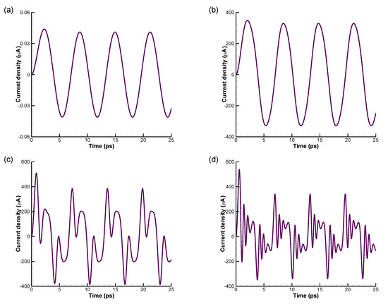 Figure 5. Effect of electric field on the time-dependent current density at (a) E 0 = 1 V/cm, (b) E 0 = 10 4 V/cm, (c) E 0 = 5 × 10 4 V/cm, and (d) E 0 = 10 5 V/cm with τ = 1.0 , β = 50 , μ = 0 , and ω = 1 .