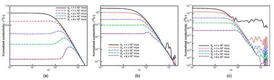 Figure 6. Effect of electric fields on the calculated (a) first order, (b) third-order, and (c) fifth-order conductivity at β = 50 , μ = 0.8 , and τ = 1 . All conductivities are normalized to low-field, zero frequency conductivity. The peaks appearing at frequencies increasing with electric field are the Bloch oscillation resonances.