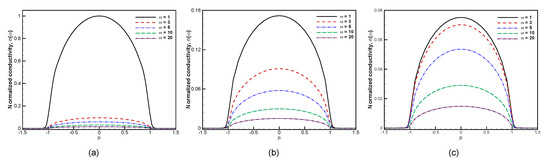 Figure 3. Computed electrical conductivity for three different relaxation times τ = 0.01 , 0.1 , and 1 at E 0 = 10 4 V/cm, β = 50 , and μ = 0.8 .