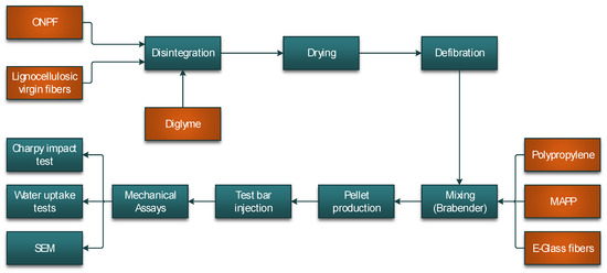 The polymeric matrix was a polypropylene (PP) by Repsol YPF (Tarragona, Spain), with the commercial name ISPLEN® PP09GM2. This is a homopolymer PP with a high melt flow index. This material is indicated for mold injection and allows being reinforced with high percentages of fiber. Its density is 0.906 g/cm3, and its melt flow rate (MFR) is 35 g/10 min (230 °C, 2.16 kg).